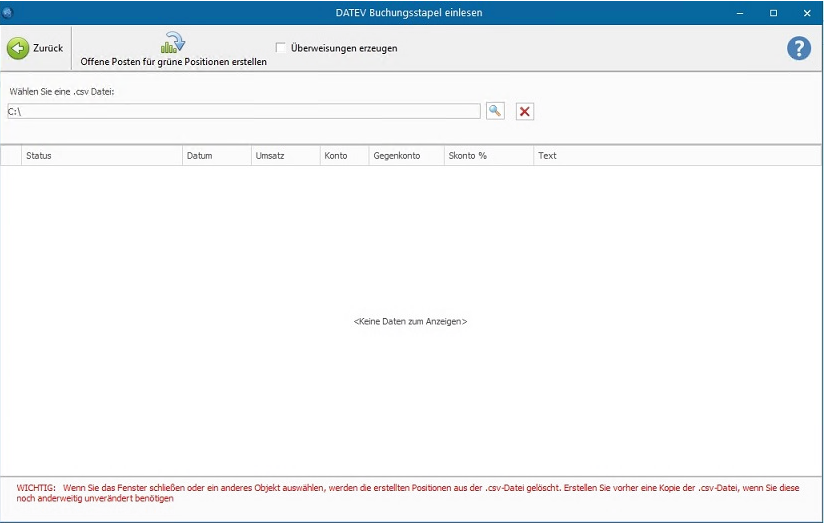 Grundvoraussetzung zur Nutzung der Funktion ist, dass Sie aus Ihrem DATEV-Programm eine gültige CSV-Datei erstellt haben.
