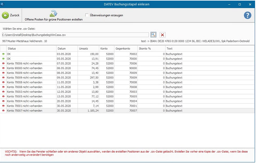 Die in der Datei vorhandenen Kontonummern (Ausgabekonten und Lieferanten) müssen in Win-CASA erfasst sein, ansonsten können die Umsätze nicht weiter verarbeitet werden.
