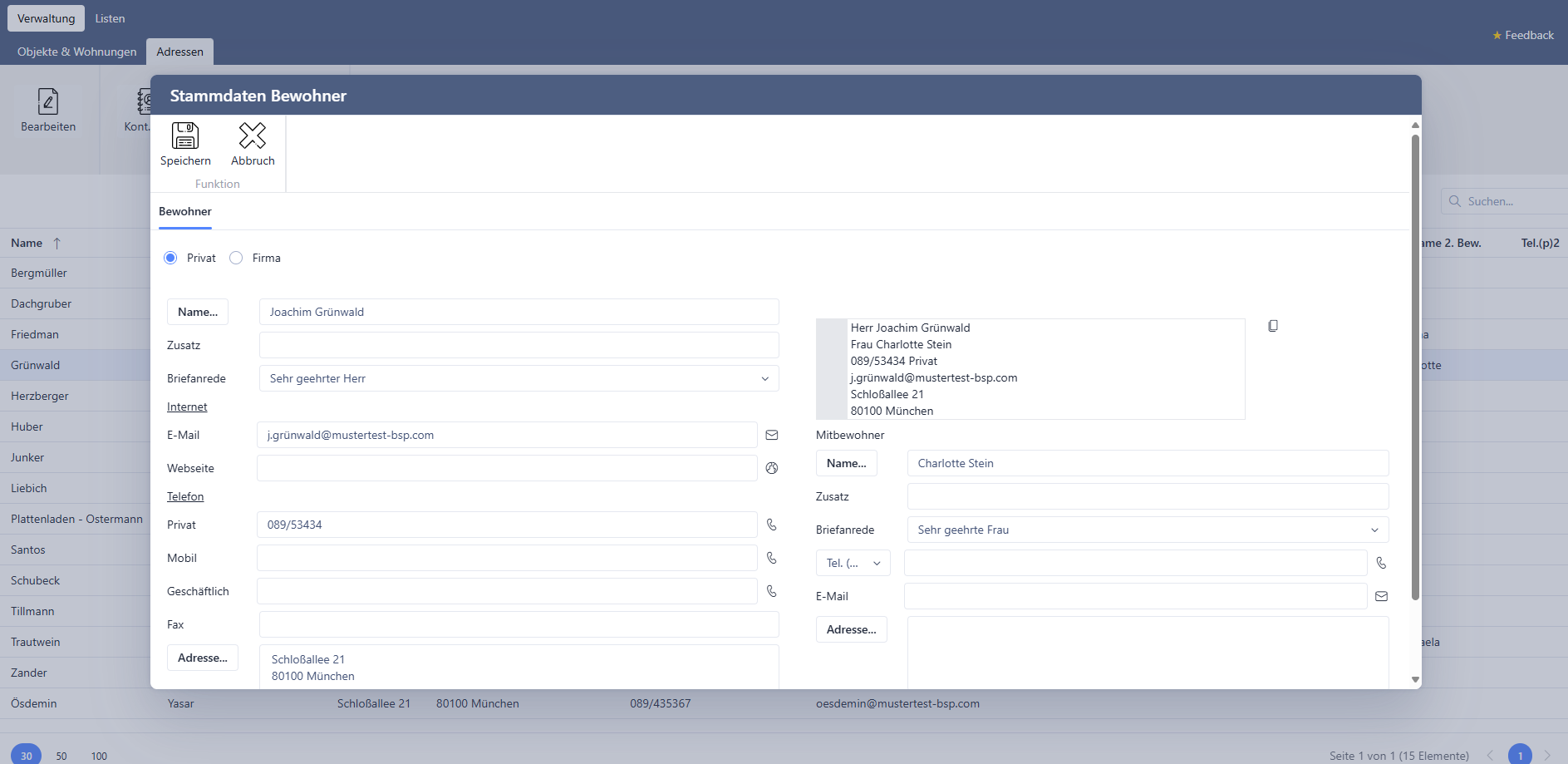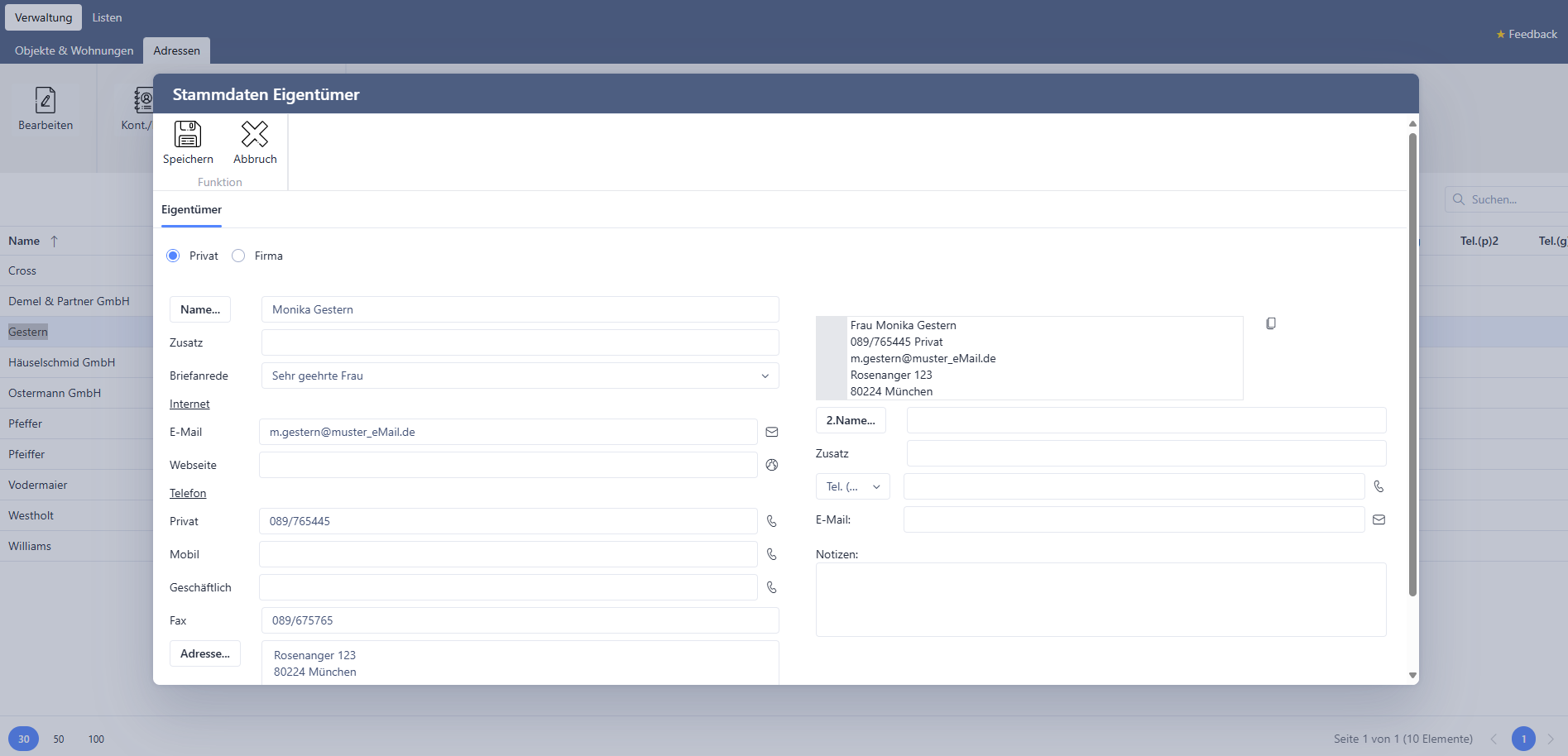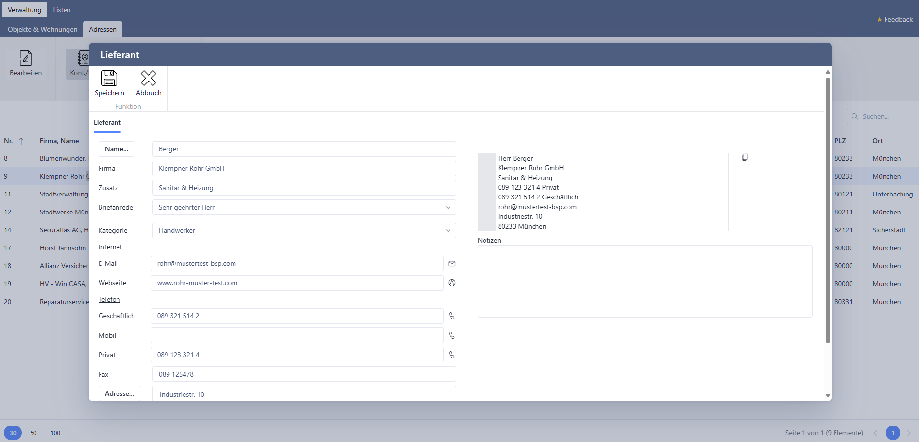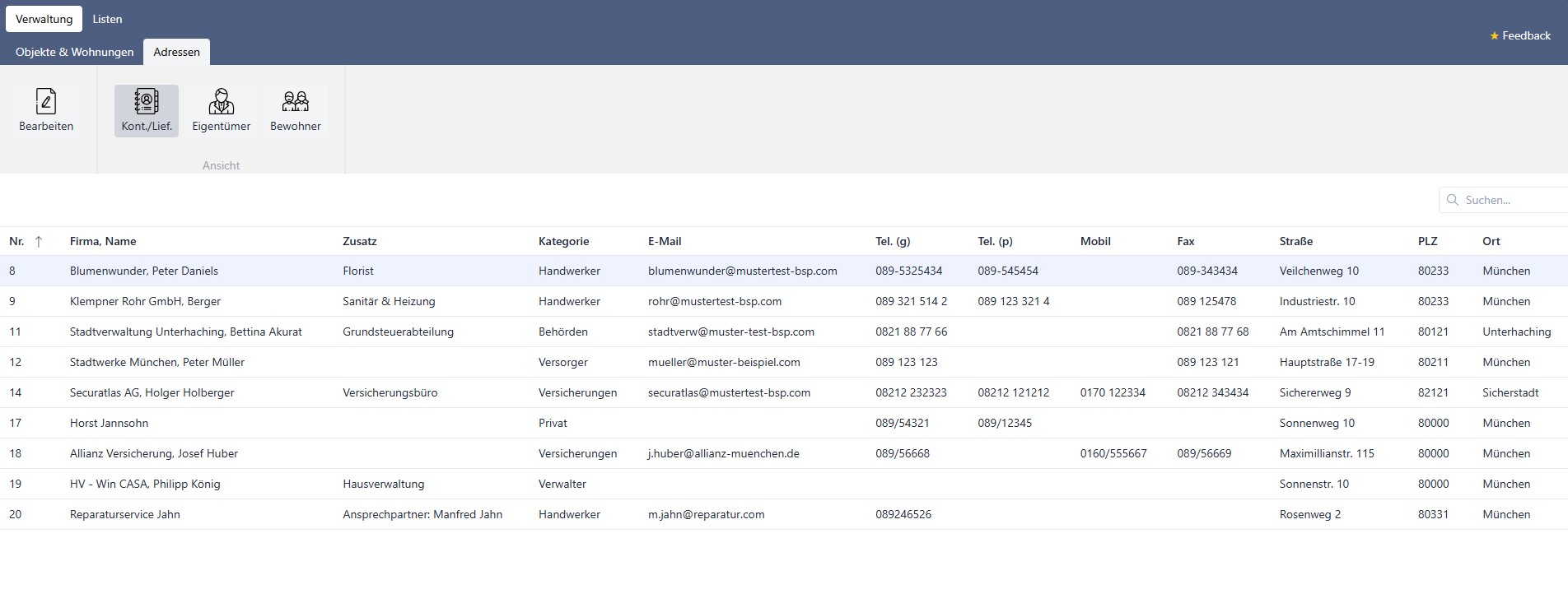 Ebenso lassen sich unter Verwaltung - Adressen wie gewohnt Kontakte, Lieferanten, Mieter & Eigentümer einsehen und bearbeiten: