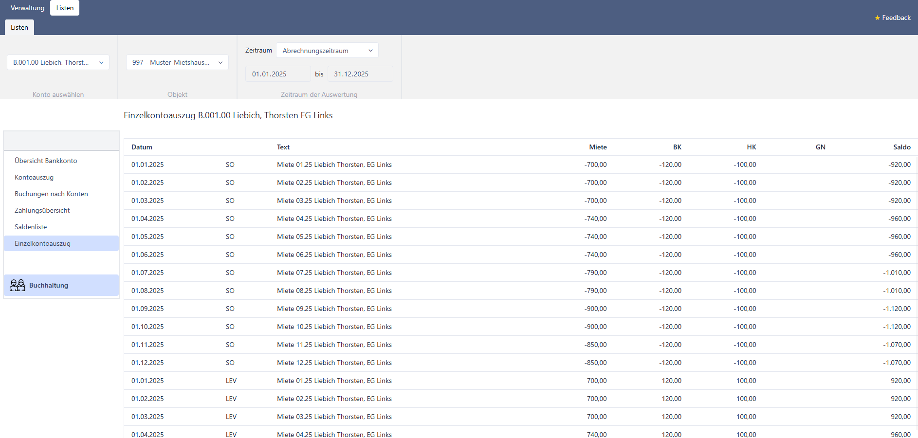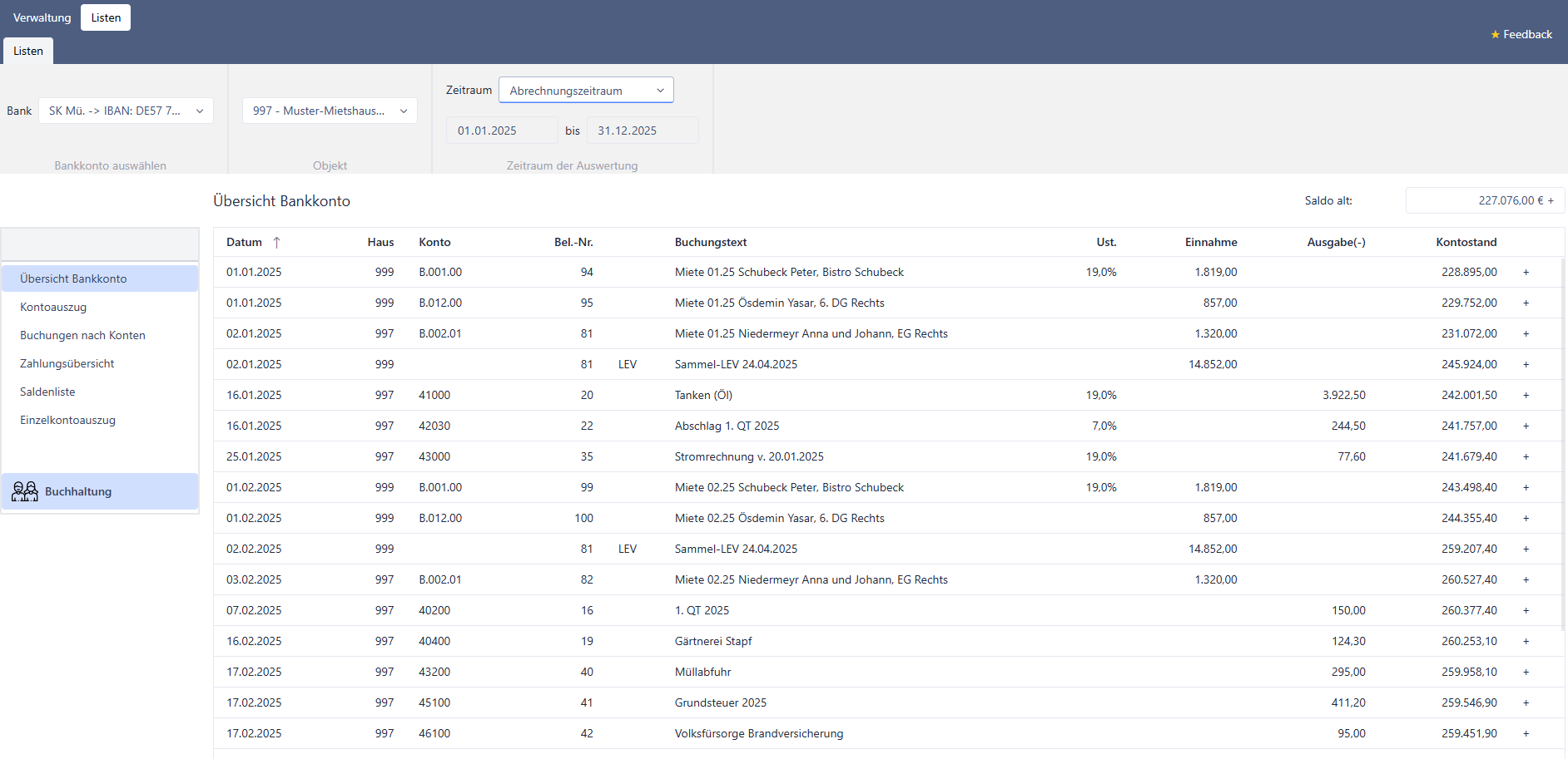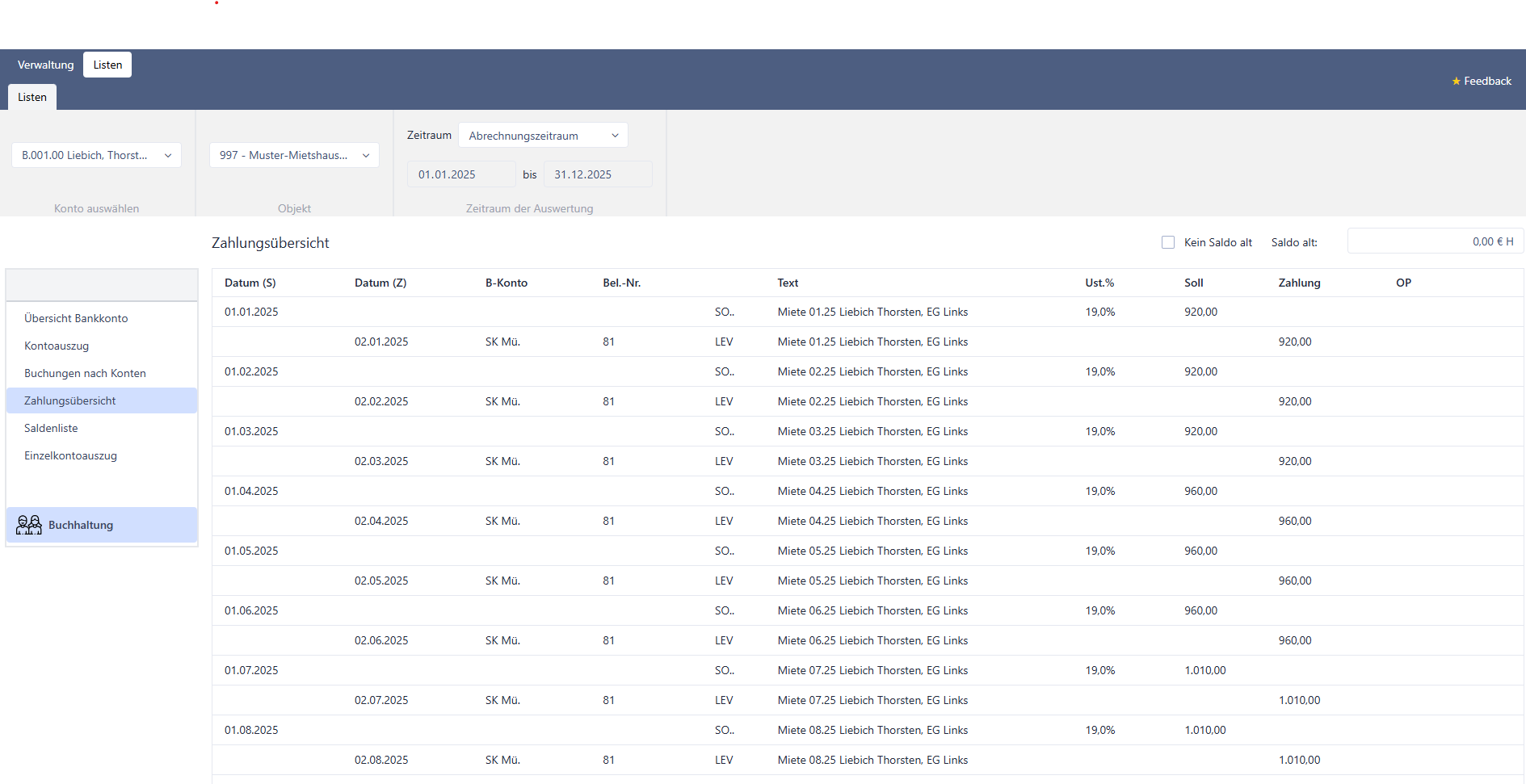 Im Bereich "Listen" können Sie in verschiedenen Auswertungen Ihre Buchungen kontrollieren: