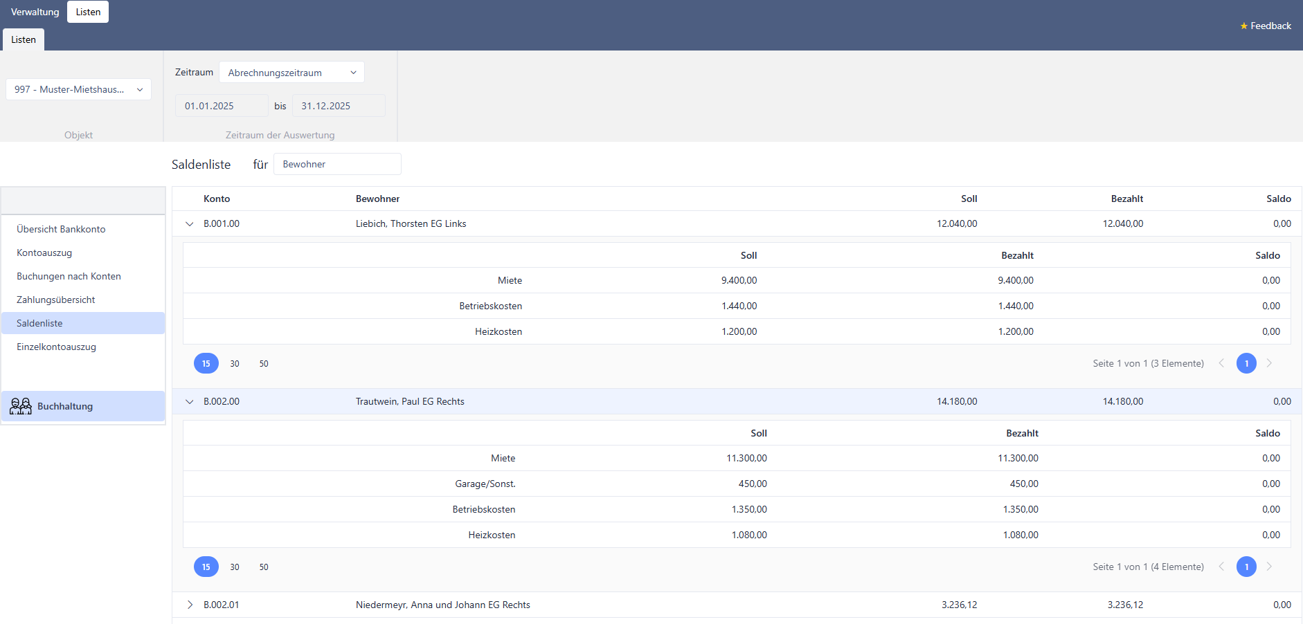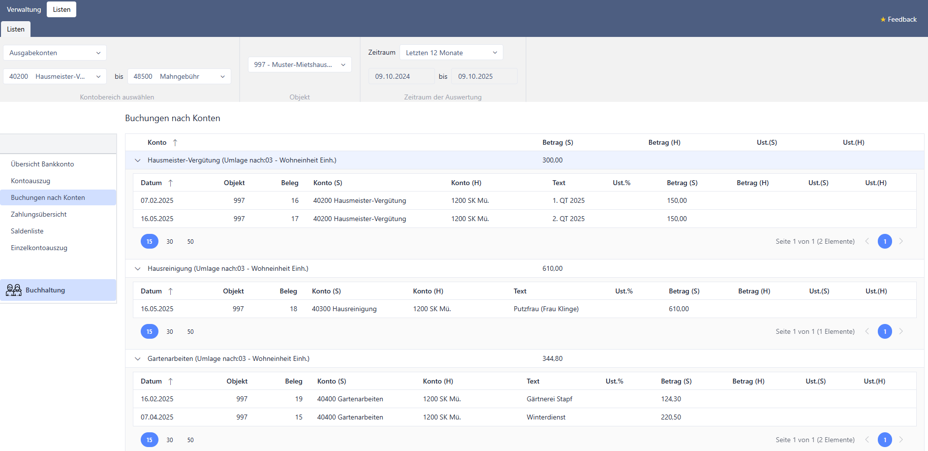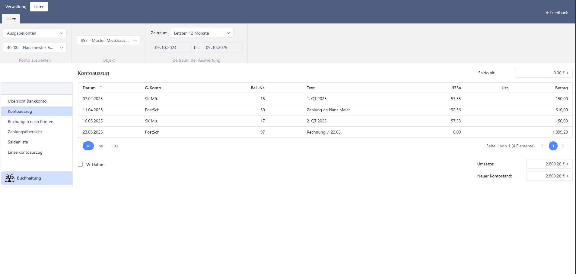 Im Bereich "Listen" können Sie in verschiedenen Auswertungen Ihre Buchungen kontrollieren: