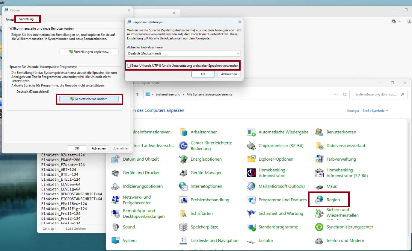 Wenn das Problem aufkommt, dass Umlaute wie Ä, Ü, Ö in Win-CASA unter Einstellungen oder den Texten in der Abrechnungen nicht korrekt angezeigt werden und trotz Datenbankänderungen der Entwicklung das Problem immer wieder auftritt (obwohl es bei uns geht) hat der KD. wohl durch ein Kürzlich durchgeführtes Windows Update eine spezielle Gebietsschema Einstellung aktiv.